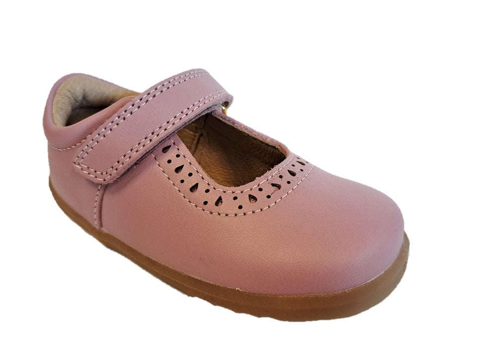 Bobux Step Up Lola is a lilac leather shoe in a classic Mary Jane style with punched-out detailing at the front. Features a padded ankle cuff for extra comfort, a Velcro strap for a secure fit, and a flexible rubber outsole. 752804