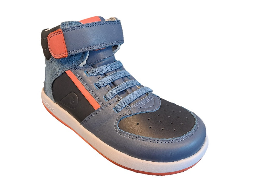 Bobux Kid+ Topspin is a blue leather and suede Hi-top boot with a padded tongue and ankle cuff for extra comfort. Features elastic laces and a Velcro strap for good adjustment, a cushioned midsole and a flexible rubber outsole for good grip.