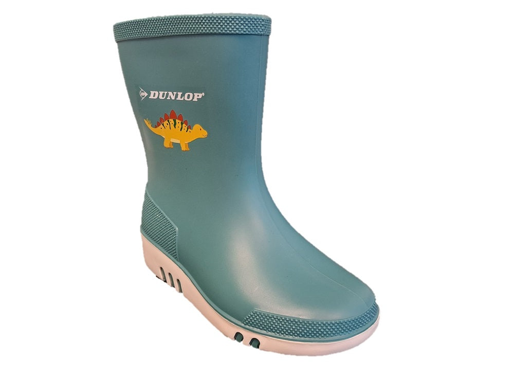 Dunlop Mini is a blue waterproof welly with quality rubber uppers and a flexible rubber sole unit. Features protective bumpers at the heel and toe, and a yellow dinosaur design on the outside.