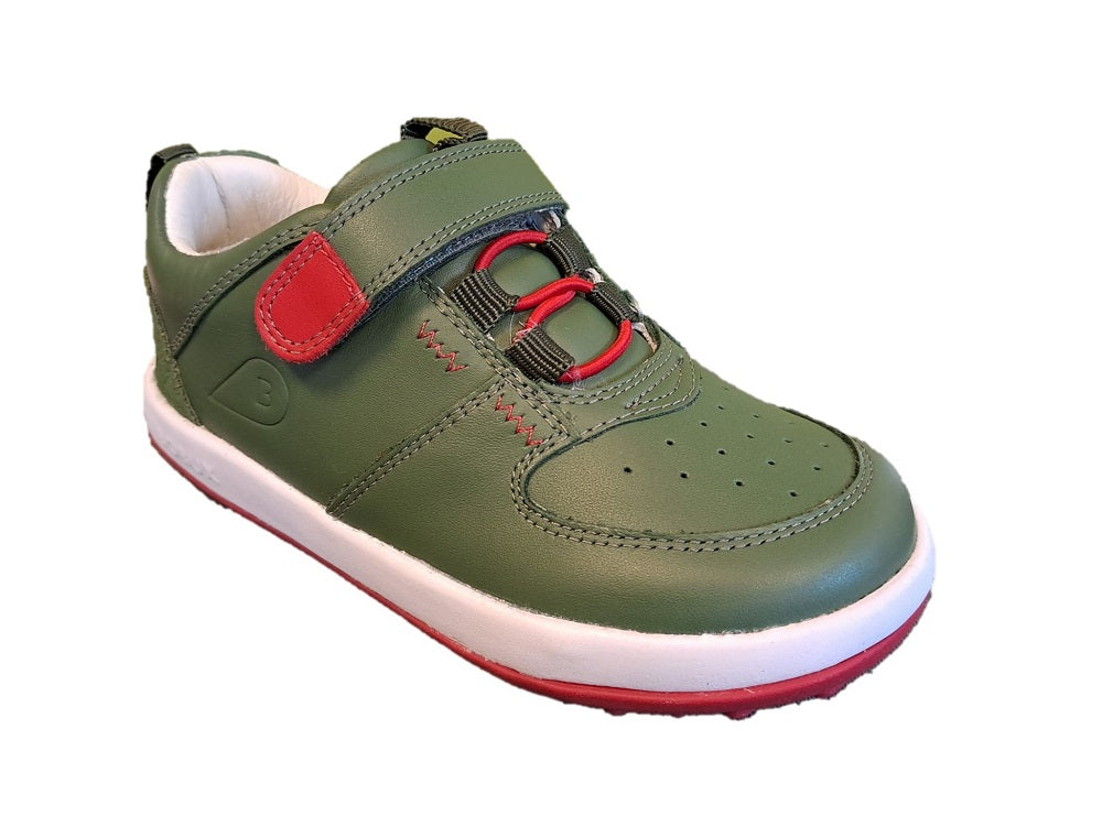 Bobux I-Walk Backspin is a green leather shoe with a padded tongue and ankle cuff for extra comfort. Features elastic laces and a Velcro strap for easy adjustment, a protective bumper at the toe, and a flexible rubber outsole for good grip.