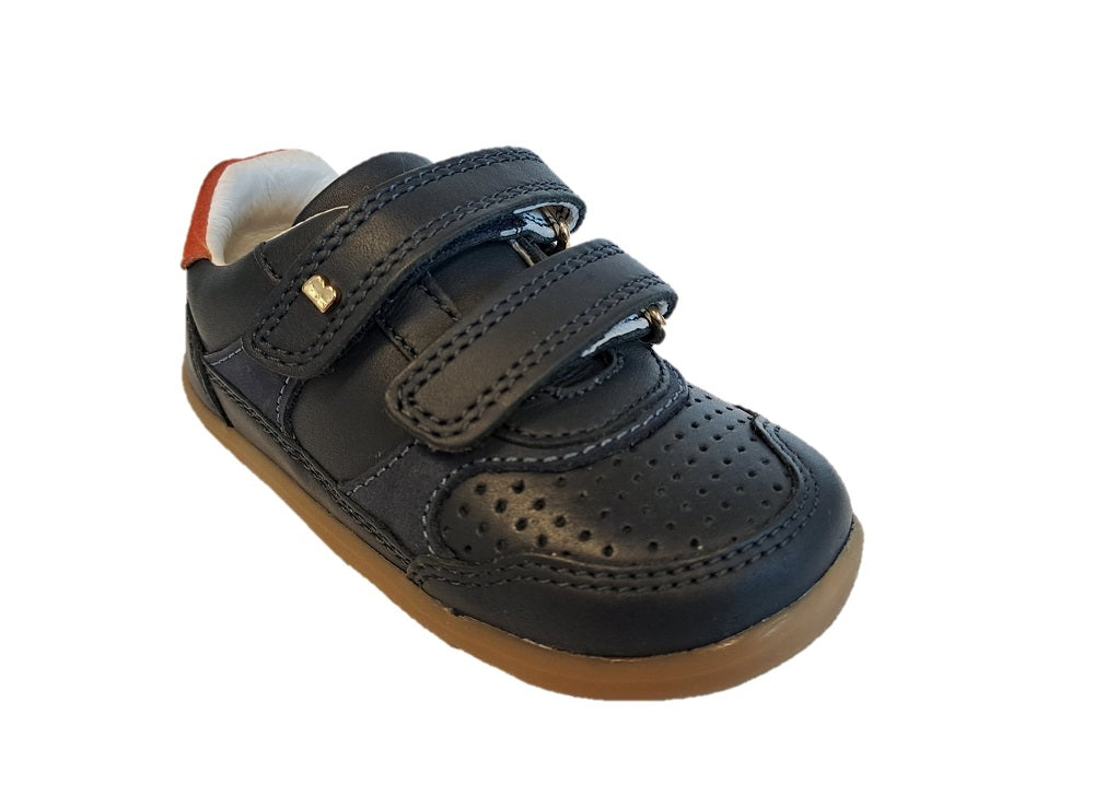 Bobux Step Up Hunter is a navy leather shoe with a padded tongue and ankle cuff for extra comfort. Features double Velcro straps for easy adjustment, a protective bumper at the toe, and a lightweight, flexible outsole.