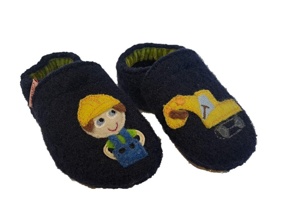 Giesswein Barum is a navy wool slipper with an appliqued builder and digger motif in coloured felt. Features an elasticated ankle cuff for a secure fit, and a non-slip rubber outsole. Machine washable.