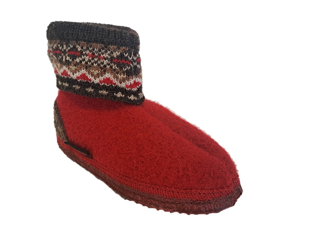 Giesswein Kristiansand is a pure new wool slipper boot in red and brown. Features a patterned knitted ankle cuff for a secure fit, and a non-slip natural rubber sole unit for good grip. Machine washable.