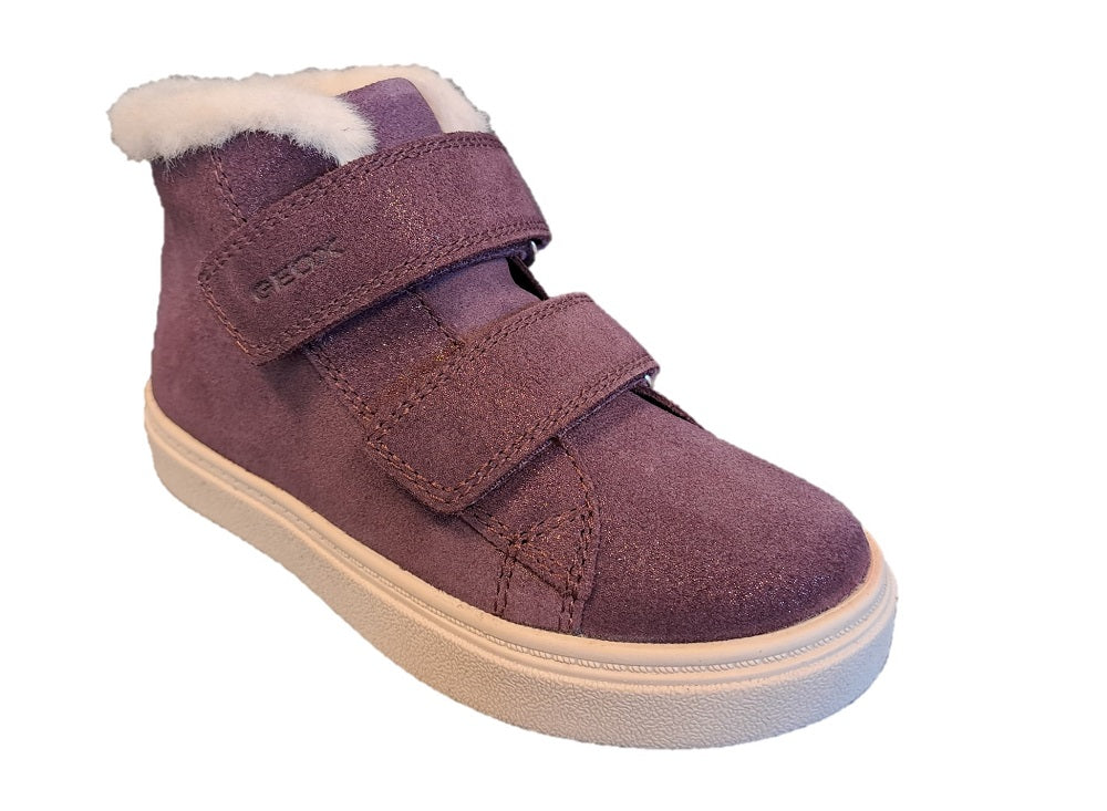 Geox Nashik is a waterproof ankle boot with glittery purple suede uppers and a padded tongue and ankle cuff for extra comfort. Features a soft faux fur trim, double Velcro straps for a secure fit, and Geox's unique breathable sole unit. B465XA
