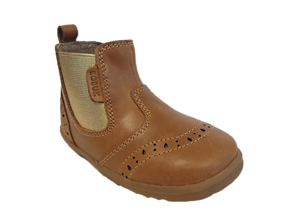 Bobux Step Up Billie is a tan leather ankle boot with brogue detailing at the toe and heel and a gold elasticated side panel for easy on/off. Features an inside zip, a soft leather lining, a cushioned leather footbed, and a flexible rubber outsole.