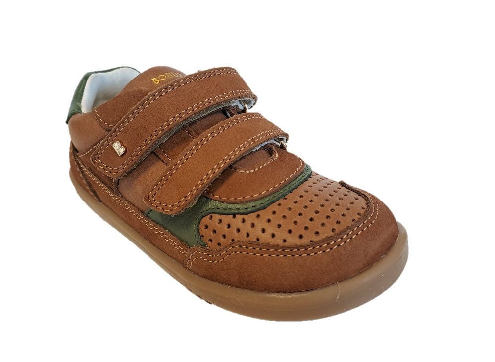 Bobux I-Walk Hunter is a tan leather shoe with a padded tongue and ankle cuff for extra comfort. Features double Velcro straps for easy adjustment, a protective bumper at the toe, and a lightweight, flexible outsole.