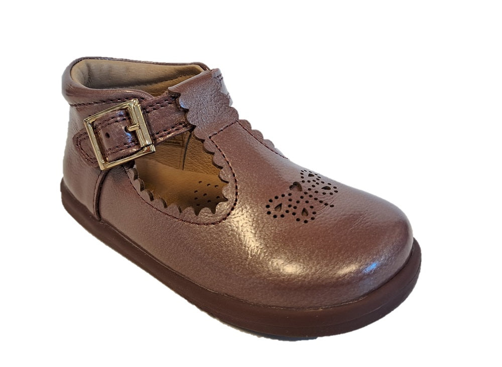 Bobux I-Walk Poppy is a purple patent leather T-bar shoe with a scalloped edge and a butterfly motif at the toe. Features a padded ankle cuff for extra comfort, a buckle fastening at the side, and a lightweight, flexible outsole.