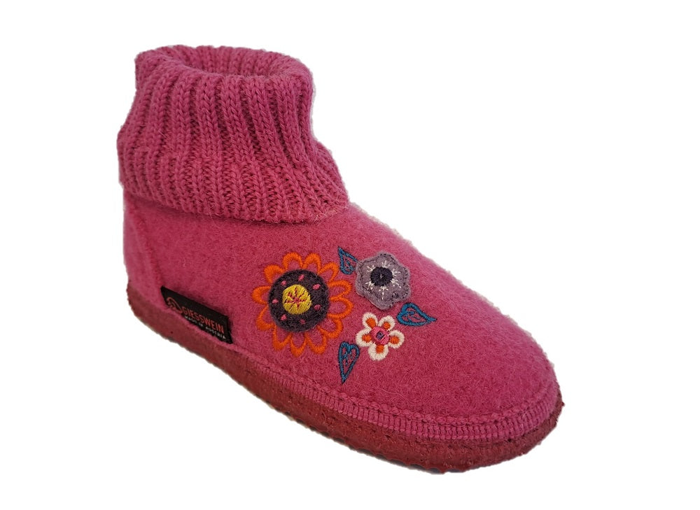 Giesswein Klixbull is a fuchsia pink woollen slipper boot with embroidered flower detailing, a knitted ankle cuff, and a non-slip natural rubber sole unit for good grip. Machine washable.