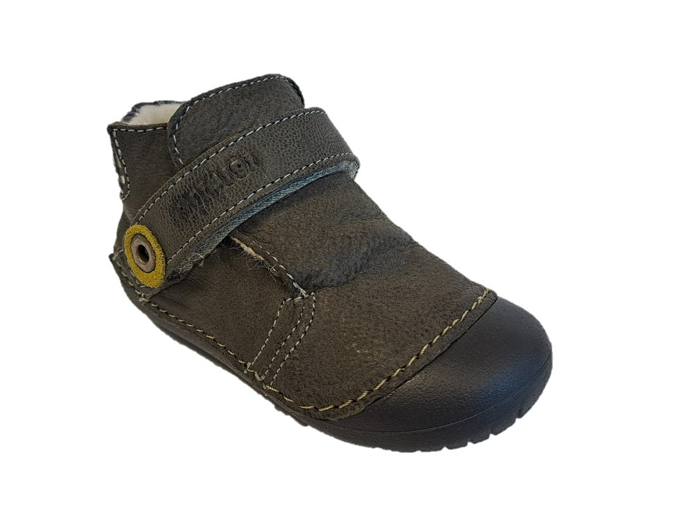 Primigi Flippy is a grey leather 'cruiser' shoe with a flexible outsole and rounded toe. Features a Velcro strap for a secure fit, a soft fleece lining, and a padded ankle cuff with grey tartan detailing at the back.