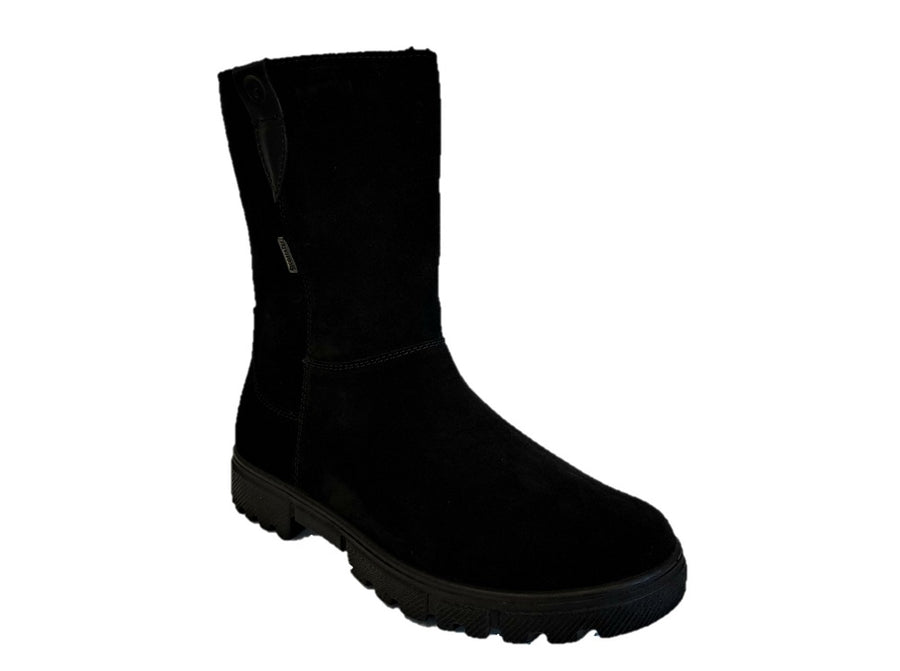 Ricosta Ria is a black suede waterproof boot with a warm fleecy lining. Features an inside zip for easy on/off, a removable cushioned footbed, and a lightweight but hardwearing outsole. 802/090